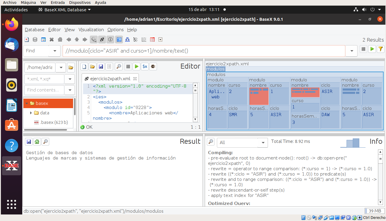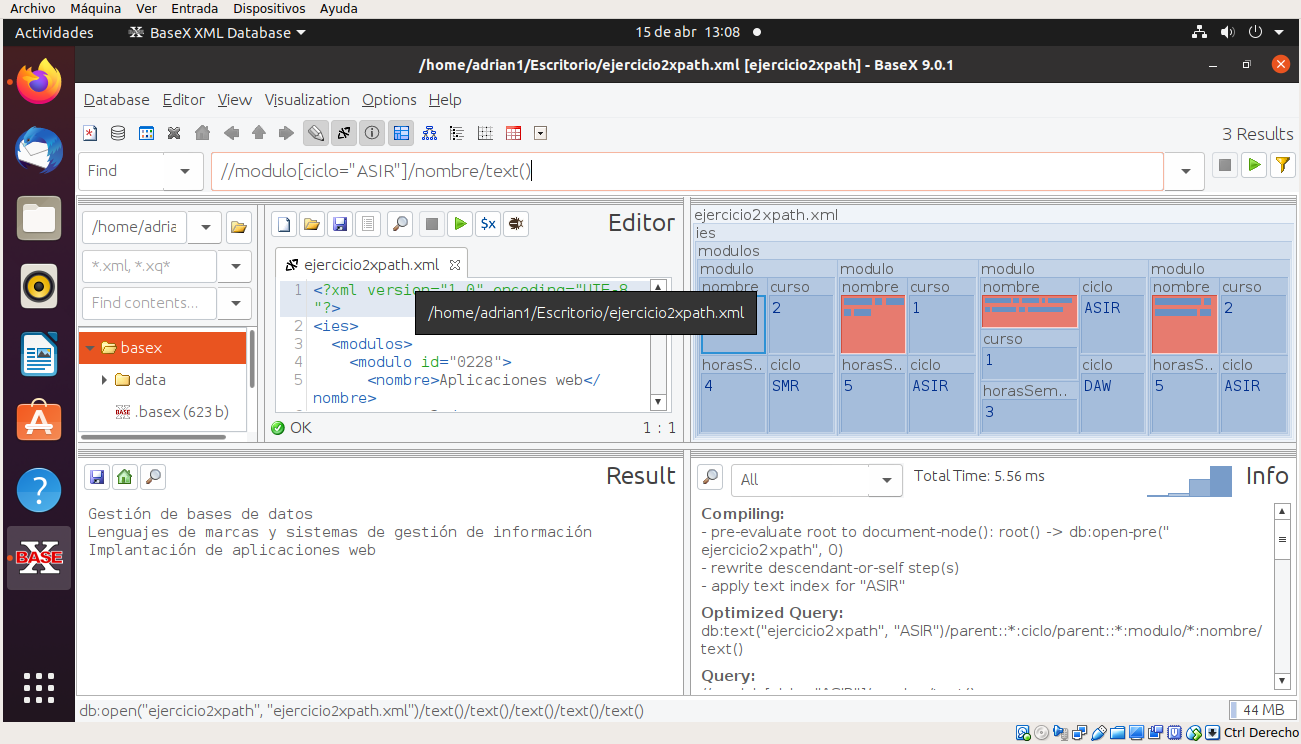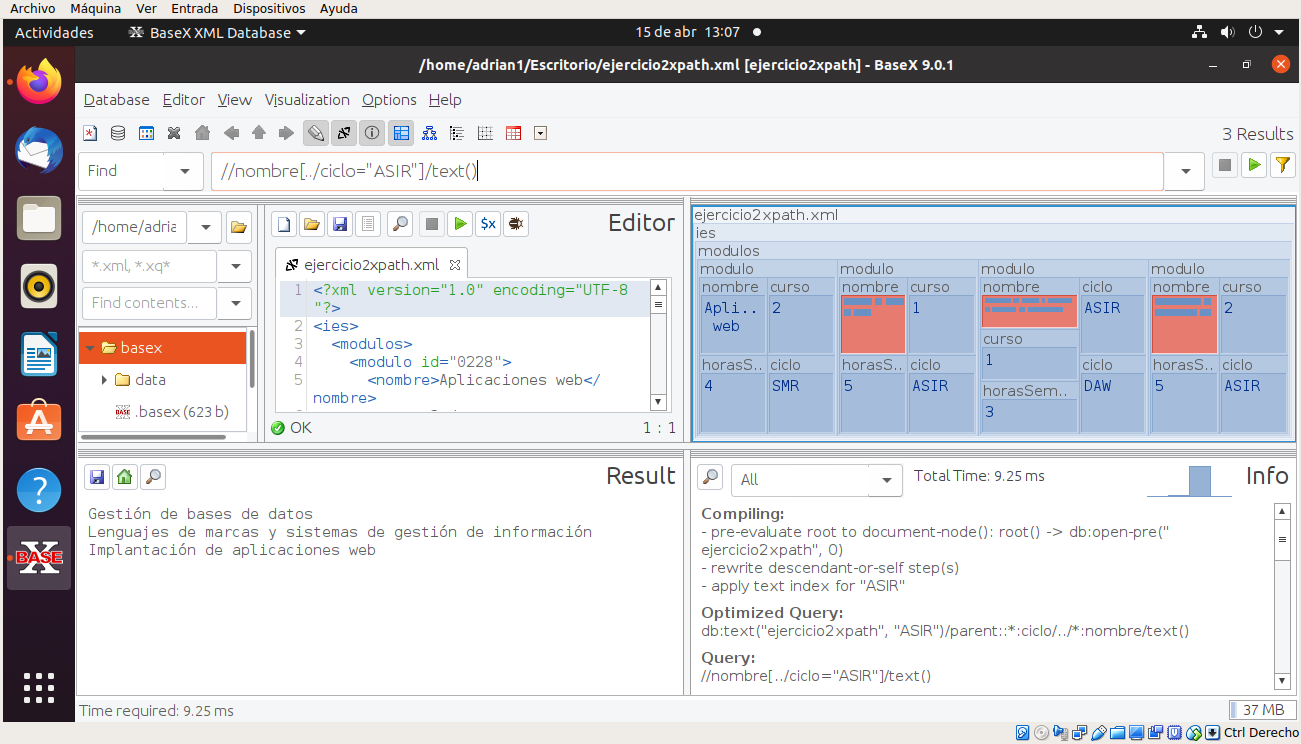 Ruta xpath:modulo[ciclo="ASIR" and curso=1]/nombre/text()