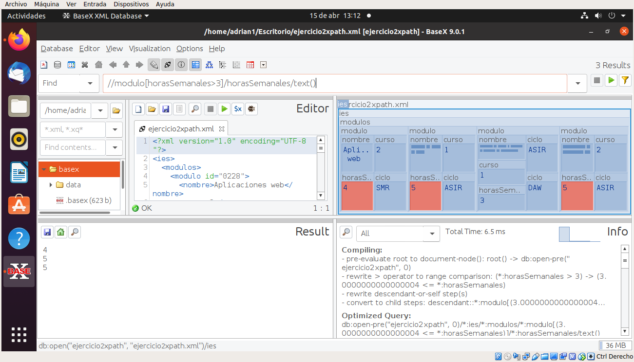 Ruta xpath:modulo[horasSemanales<5]/nombre/text()