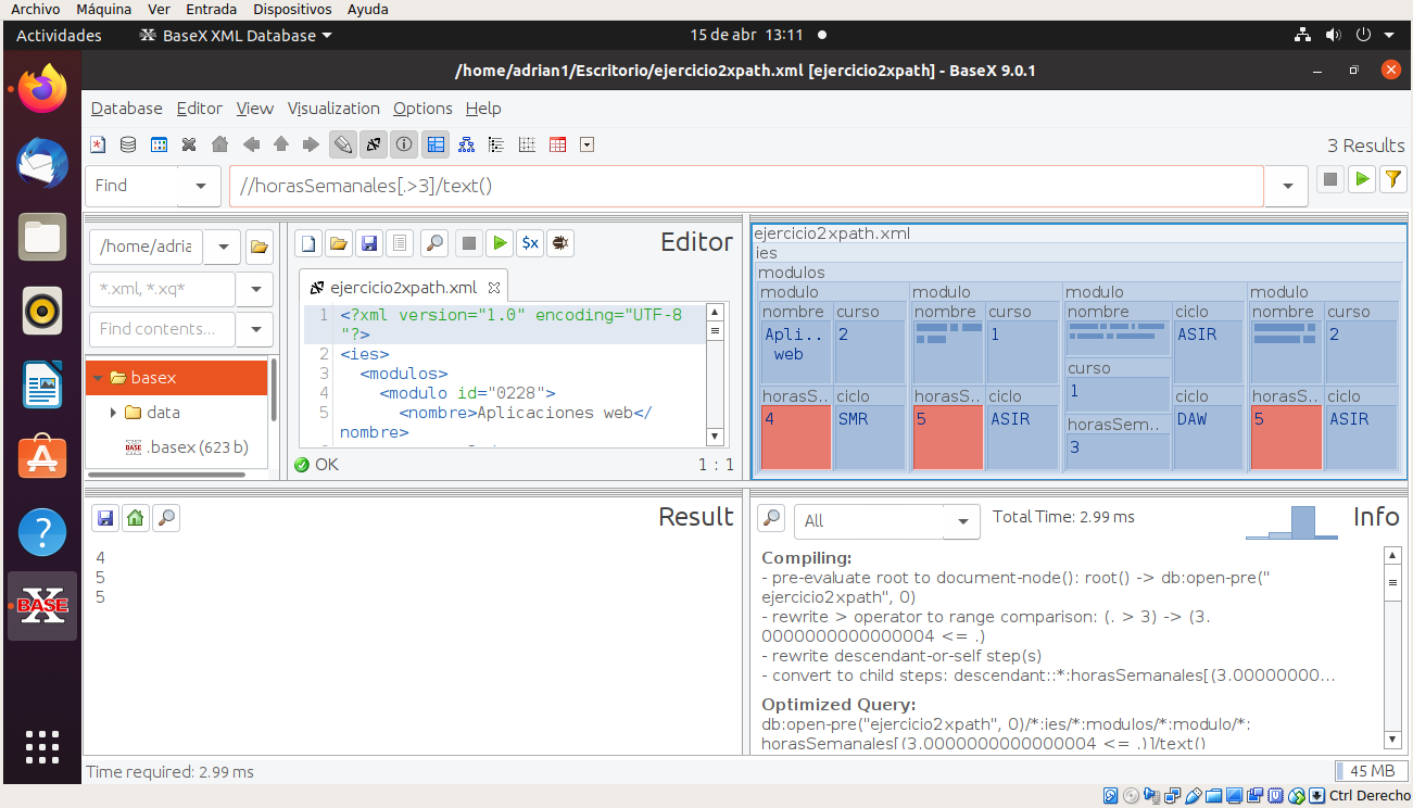 Ruta xpath://modulo[horasSemanales>3]/horasSemanales/text()